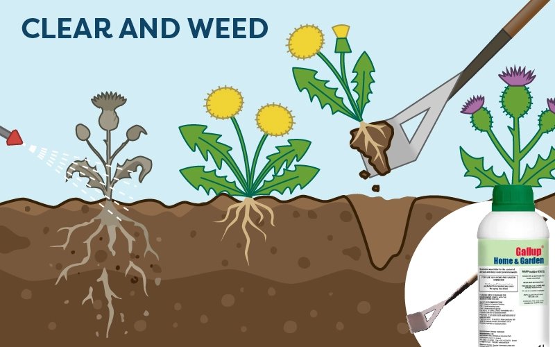 For total weed control in a pre-planting area, Roundup Pro Active 360 is a professional-standard systemic weed killer that kills down to the root. Alternatively use Gallup Home and Garden which can be used without professional training.