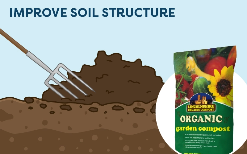 Organic matter, such as compost, well-rotted manure, leaf mould, and green manure, enhance soil aeration, water retention, and nutrient availability – whatever your soil type. But for heavy clay soils, you may need to work a little harder to improve drainage. Consult our guide on amending clay soils here.
